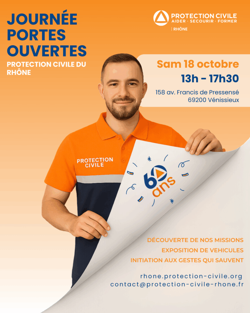 En 2025, la Protection Civile du Rhône célèbre ses 60 ans d’engagement au service de la population. À cette occasion, nous vous invitons à une journée portes ouvertes exceptionnelle pour découvrir nos missions, rencontrer nos bénévoles et partager un moment convivial autour des valeurs qui nous animent : aider, secourir, former.